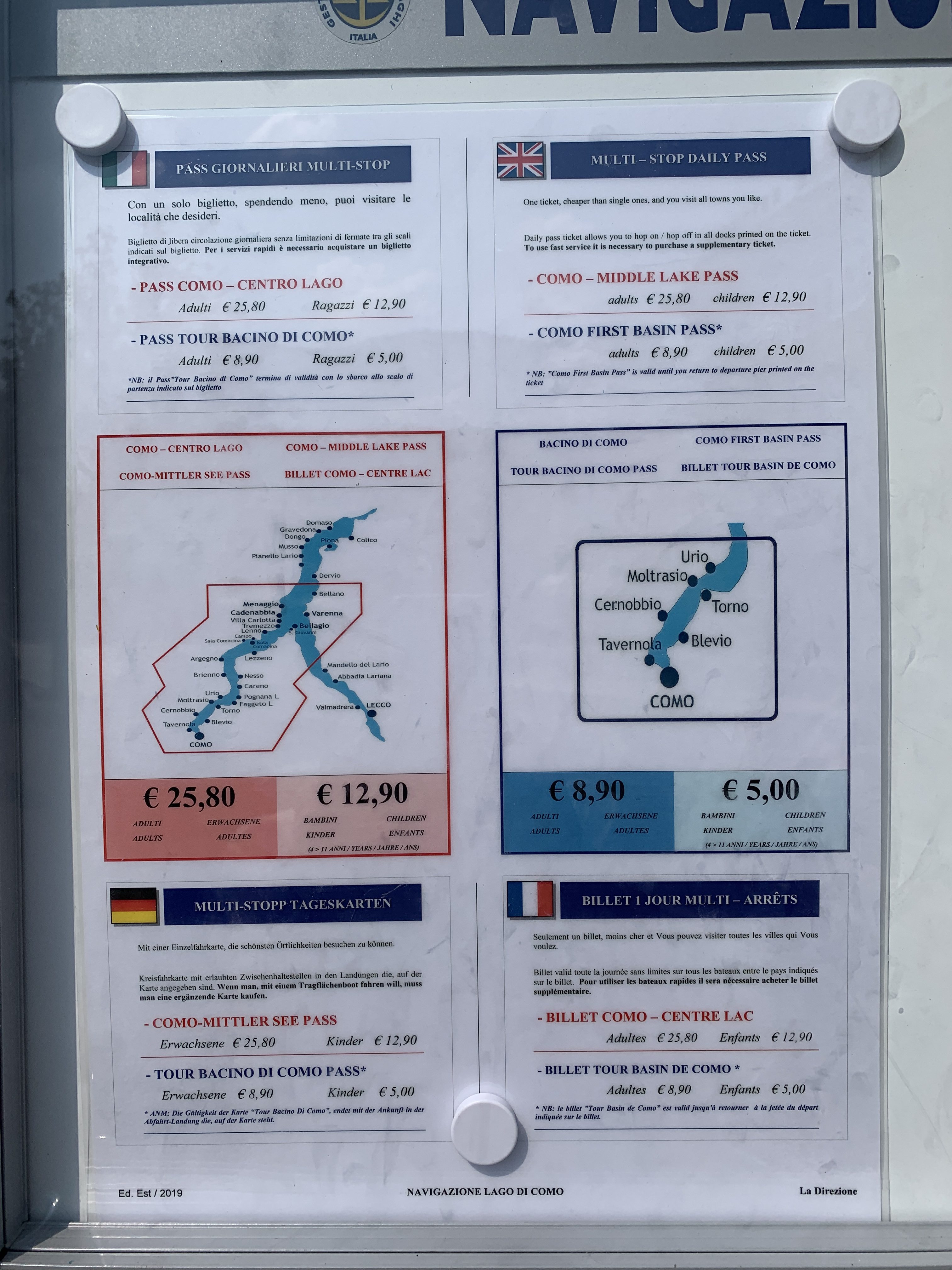• Pases diarios: Es un único pasaje de libre circulación y sin limitación de paradas. Es decir que podrás subir y bajar de los barcos (dentro de la zona de su pase) todas las veces que quieras. Existen dos pases de este tipo: Como – Centro del lago y Tour cuenca de Como (ver foto).
